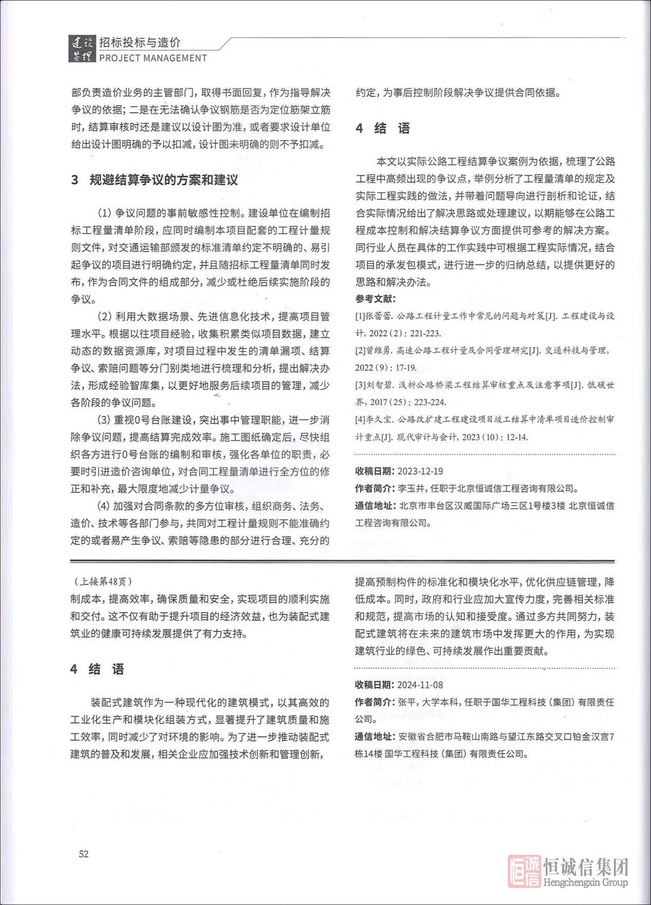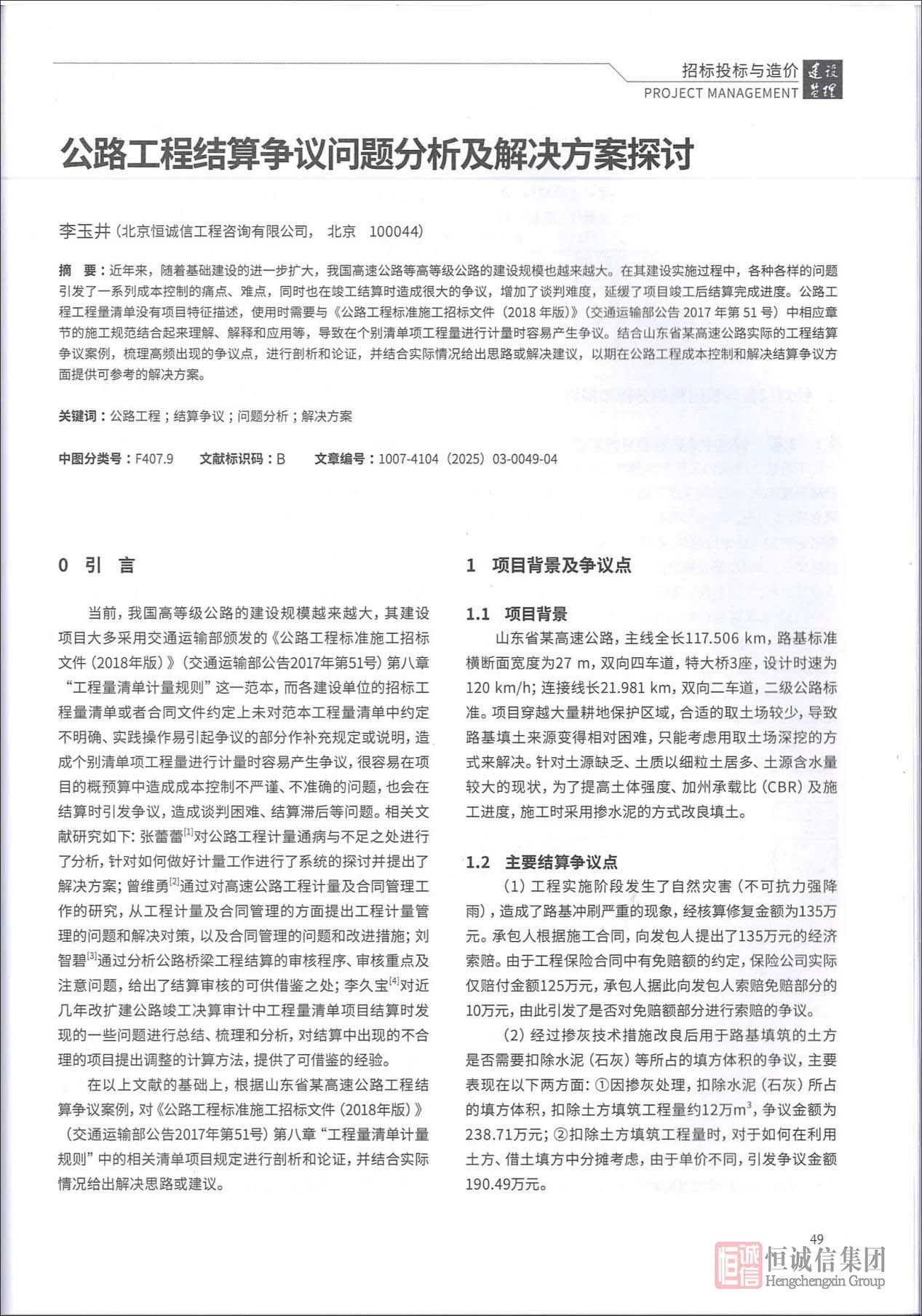 近日,恒誠信集團技術(shù)部總經(jīng)理李玉井的學(xué)術(shù)成果《公路工程結(jié)算爭議問題分析及解決方案探討》在工程建設(shè)領(lǐng)域核心期刊《建設(shè)監(jiān)理》(Project Management)2025年第3期"招標投標與造價"專欄正式刊發(fā)。