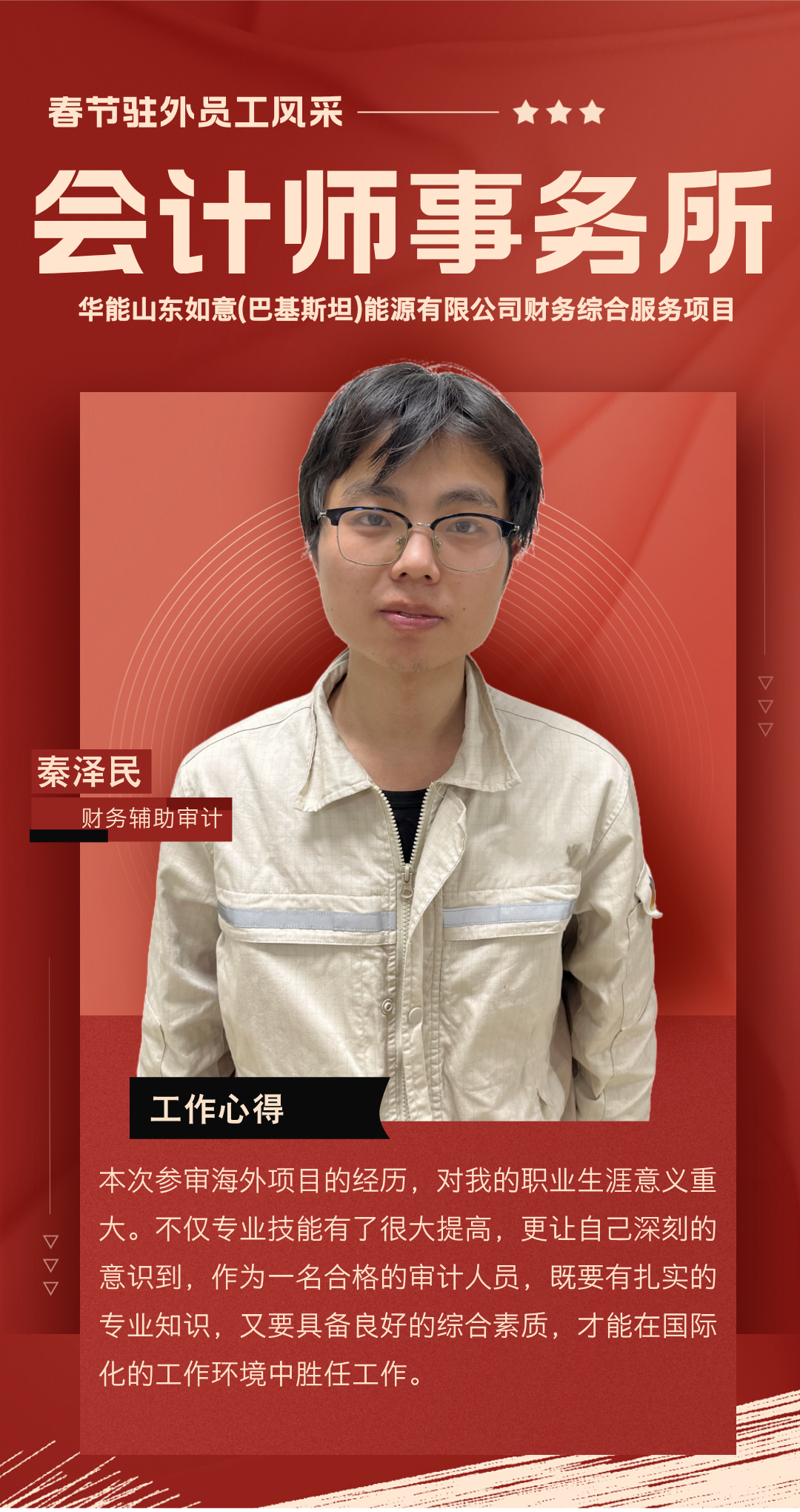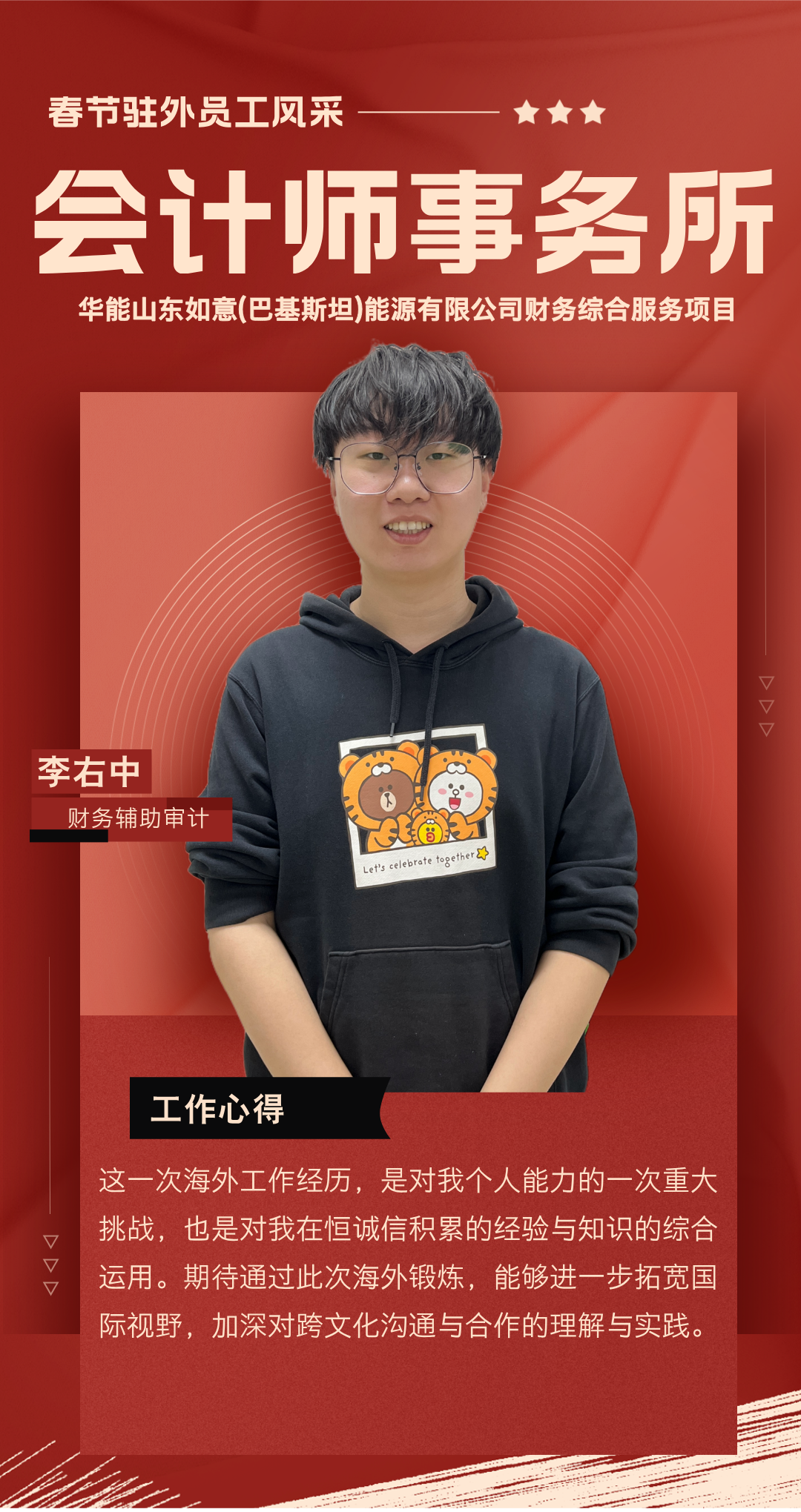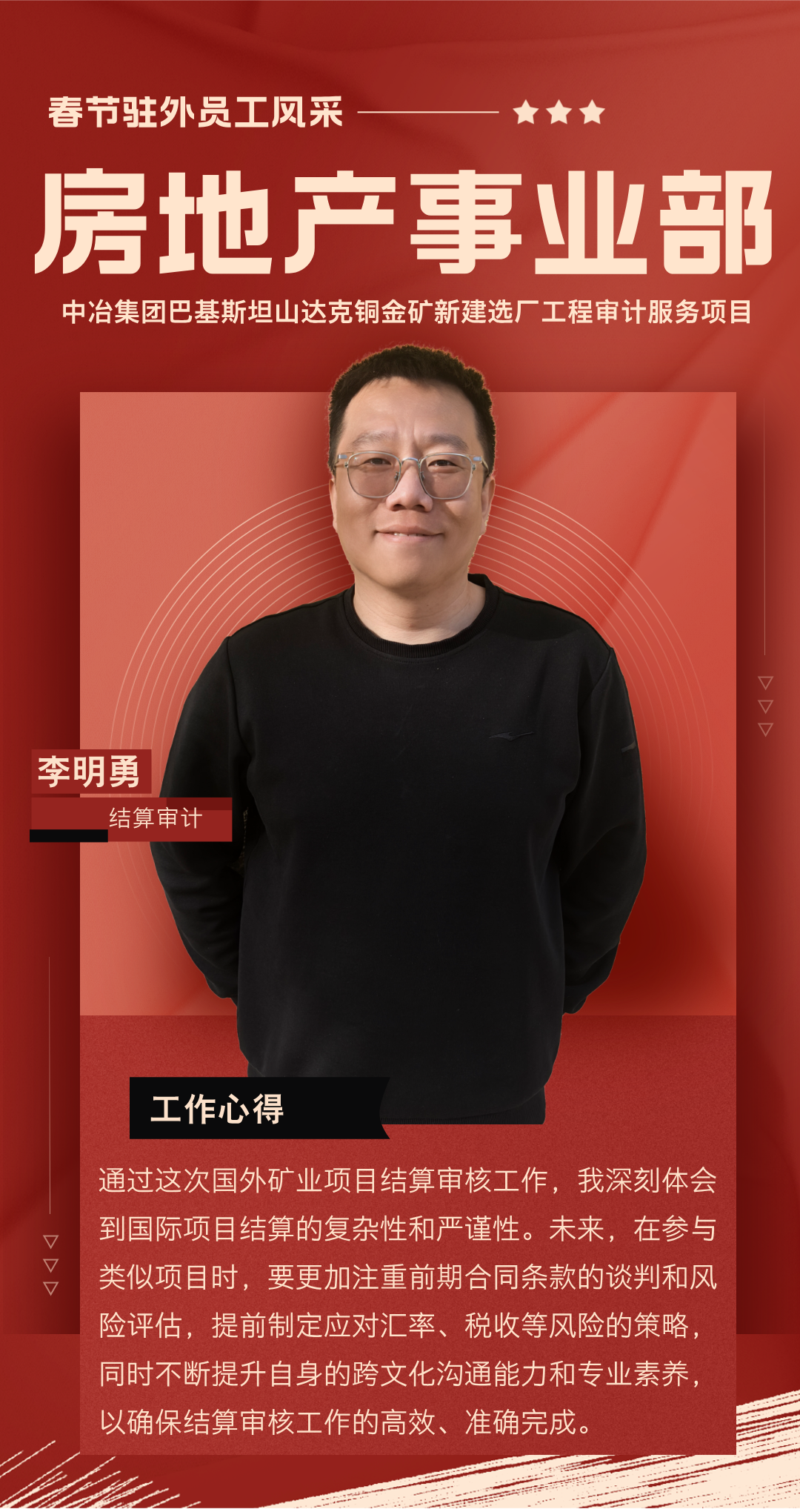 過(guò)去一年,你們背井離鄉(xiāng),奔赴海外項(xiàng)目一線,勇挑集團(tuán)賦予的重任,在異國(guó)他鄉(xiāng)的土地上默默耕耘。你們憑借扎實(shí)的專業(yè)知識(shí),為項(xiàng)目的穩(wěn)步推進(jìn)筑牢根基;用非凡的智慧與辛勤的汗水,為公司贏得了良好聲譽(yù);更以實(shí)際行動(dòng),深刻詮釋了恒誠(chéng)信人應(yīng)有的責(zé)任與擔(dān)當(dāng)。你們以精湛的專業(yè)服務(wù)在項(xiàng)目咨詢和審計(jì)工作中實(shí)現(xiàn)突破,樹(shù)立了恒誠(chéng)信不畏艱險(xiǎn)、攻堅(jiān)克難、善作善成的企業(yè)品牌。廣大員工家屬識(shí)大體、顧大局,精心操持家庭、勇于承擔(dān)重負(fù),全力排解后顧之憂,給予駐外員工開(kāi)拓進(jìn)取、再創(chuàng)佳績(jī)的信心與勇氣。